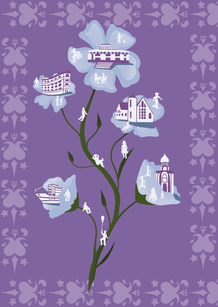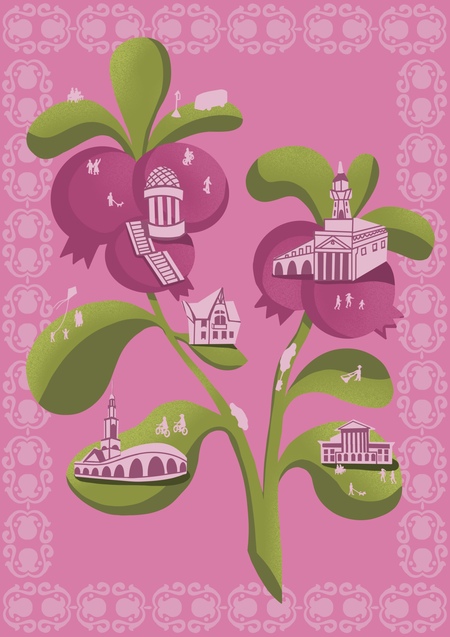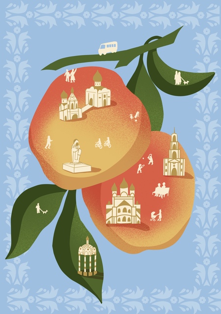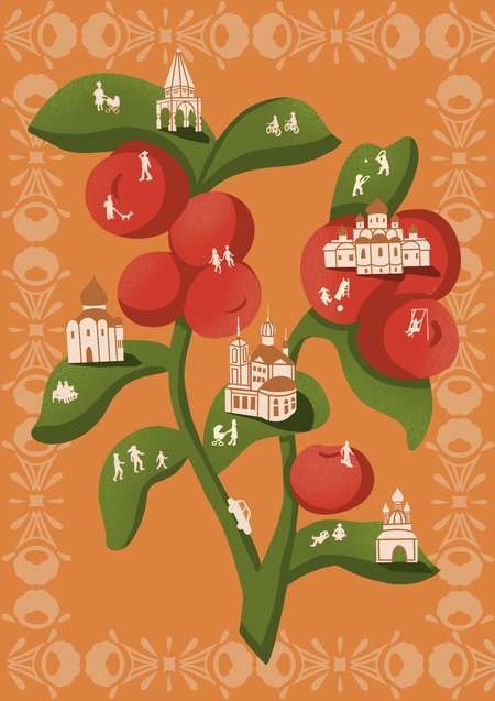Золотое кольцо России глазами натуралиста и иллюстратора. Девять городов — девять растительных эмблем, рассказывающих свою историю без слов. От суздальского резного огурца до нежной владимирской вишни — каждый символ раскрывает душу места через язык ботанической иллюстрации.