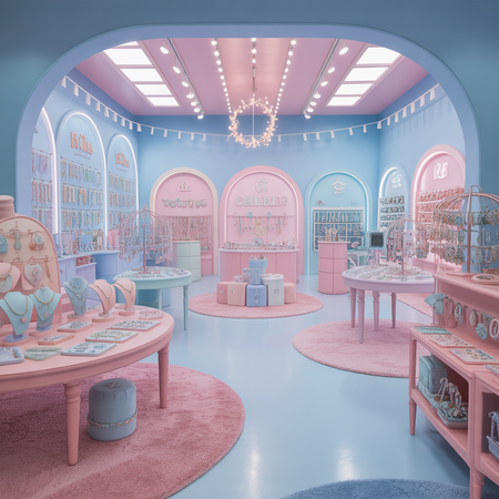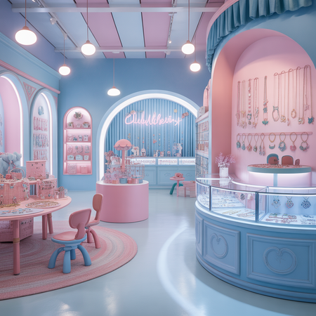 Пространство магазина: Промт: «Создать дизайн интерьера магазина для LP — Little Passion.» AI Prompt: «Design the interior space for the LP — Little Passion store, utilizing soft pink and soft blue colors throughout. The store should have an inviting and whimsical atmosphere, with displays featuring charming illustrations of two birds, a mother bird and her chick, adorning the walls. Incorporate playful furniture and decor elements, such as cozy seating areas for parents and children. The layout should allow for easy navigation, with the 'Sample' font used for signage and product labels to create a cohesive brand experience that reflects warmth, love, and joy.»