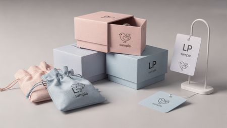 Носители бренда (упаковка): Промт: «Разработать упаковку для детских украшений.» AI Prompt: «Design packaging for children’s jewelry LP — Little Passion, incorporating soft pink and soft blue colors. The packaging should feature two birds, a mother bird and her chick, conveying care and affection. The design should utilize the 'Sample' font and include playful elements, such as bright patterns or fun shapes, making the packaging exciting and attractive for children and appealing to parents as a gift option.»
