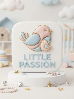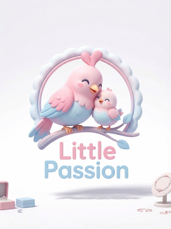 Логотип: Промт: «Создать логотип для детских украшений LP — Little Passion.» AI Prompt: «Create a logo for children’s jewelry LP — Little Passion, using soft pink and soft blue colors. The logo should feature an artistic representation of two birds, a mother bird and her chick, symbolizing nurturing and love. The design should be playful and inviting, incorporating the 'Sample' font, which is smooth and whimsical, appealing to both children and parents. Consider adding subtle elements like stars or clouds in the background to enhance the playful theme.»