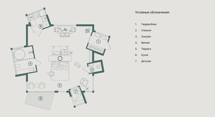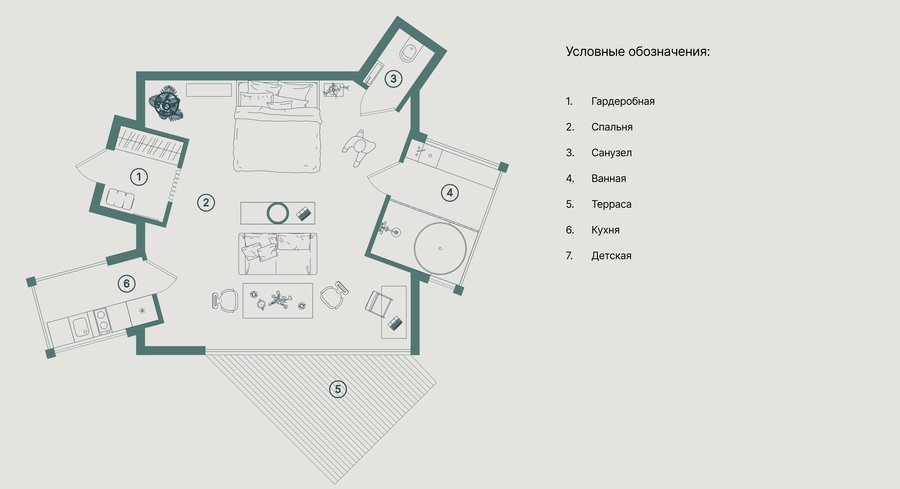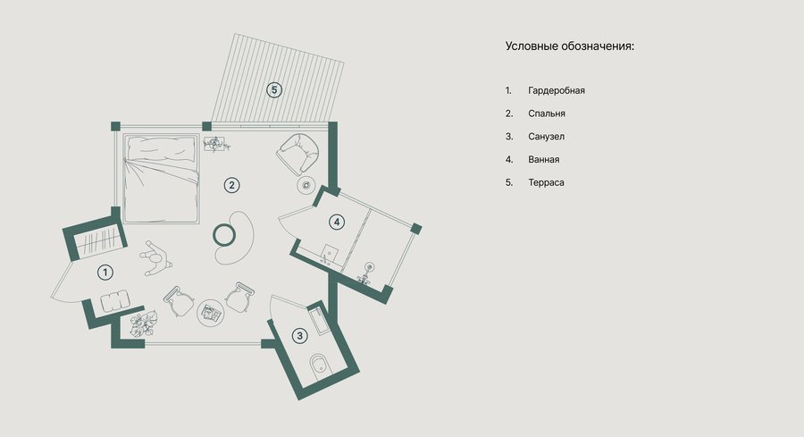 - Номера создаются из простых острых геометрических форм, где центром является спальня, а все остальные дополнительные функции встраиваются в нее под разными углами. Такое маневрирование, безусловно, помогает не нарушать существующий природный ландшафт.