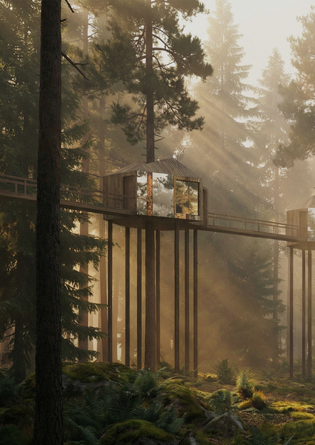 Отель строится из обособленных домиках, которые выполняют определенные функции.