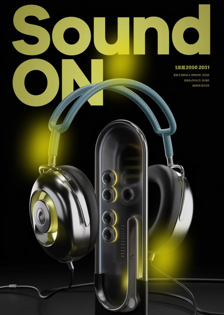 3. A 3D render of a marketing poster with the text «sound on» in the Helvetica font. The poster has a black and yellow color scheme. The background is black. There is a futuristic metallic recording studio equipment, such as a headphones with a Japanese fashion style. The overall design is sleek and modern.