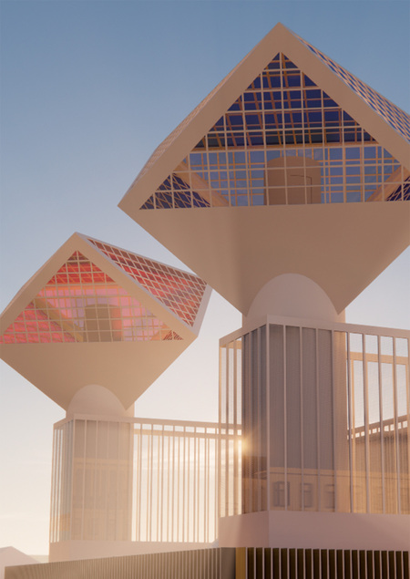 Архитектурный фасад создан исходя из композиционных принципов коллажа художника и представляет собой яркое здание с двумя смотровыми площадками. Поднявшись наверх, посетитель выставки может посмотреть на мир под призмой цвета.