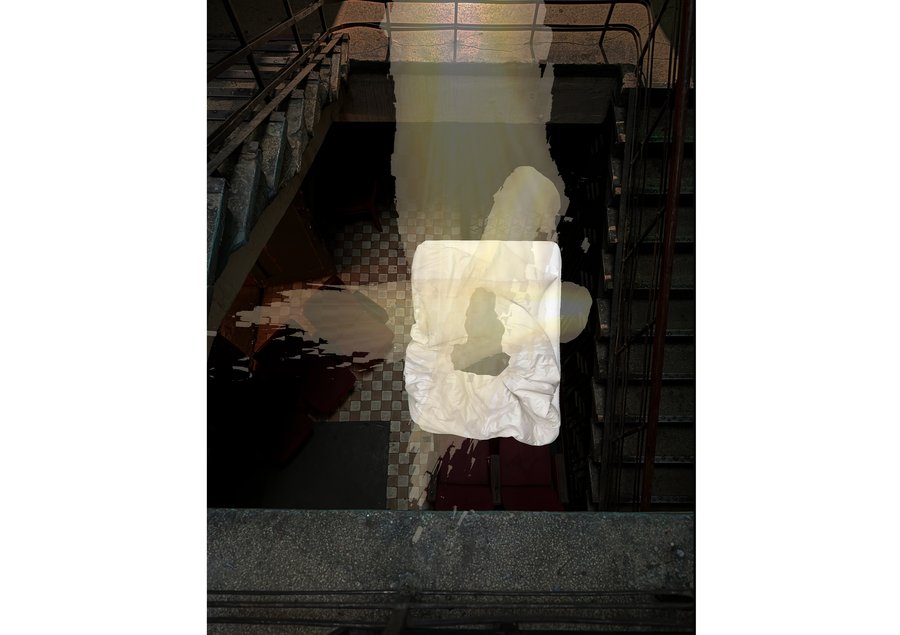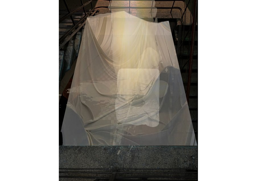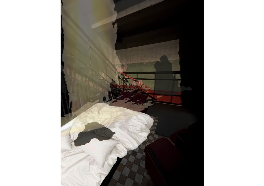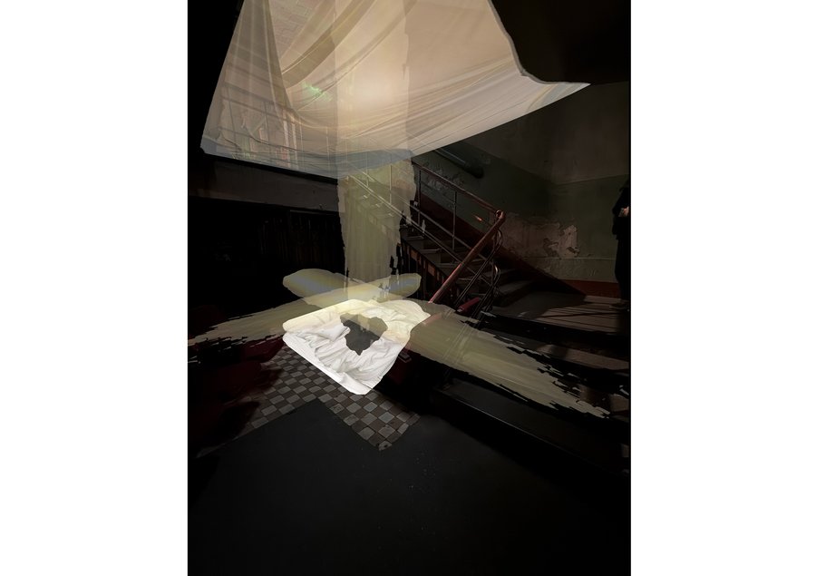 • Основные элементы: металлические или гипсовые скульптурные фигуры, либо живые перформеры, отбрасывающие тени. Они расположены по углам за решеткой, вдоль стен, усиливая ощущение погружения в вакханалию. Между этажами сверху натянут парашютный шелк, через который просвечивает вид на пару сверху вниз. • Свет: направленный жесткий свет с мягким контуром, как будто гости лично поймали распутников с поличным. • Материалы: гипс (?), синефоль, парашютный шелк + матрас. • Дополнительно: возможны зеркальные или полупрозрачные элементы, создающие множественные слои теней, усиливая эффект глубины.