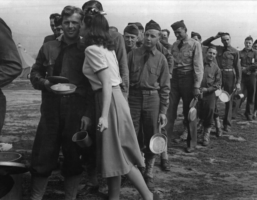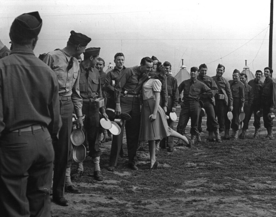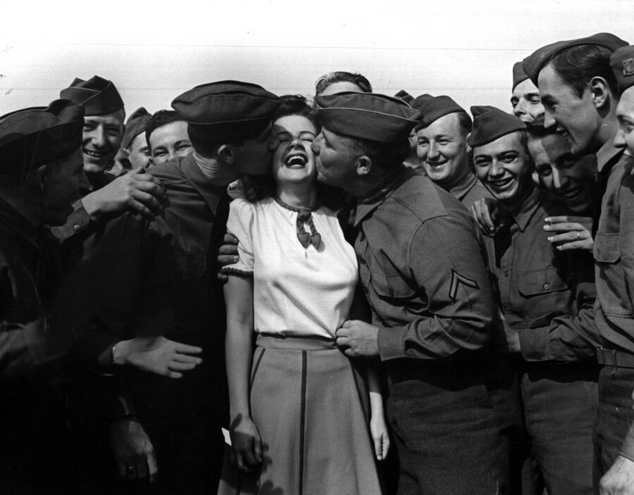 John Florea — Actress Marilyn Hare being kissed by soldiers, 1942