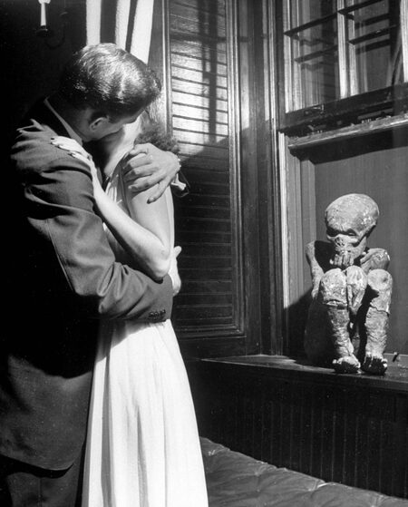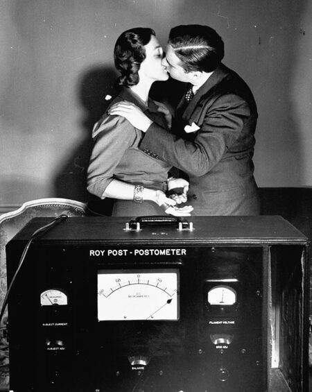 Herbert Gehr — A man and woman kissing while geared to a lie detector, 1939 Alfred Eisenstaedt — Couple kissing in front of the Delta Tau Delta mummy, 1940