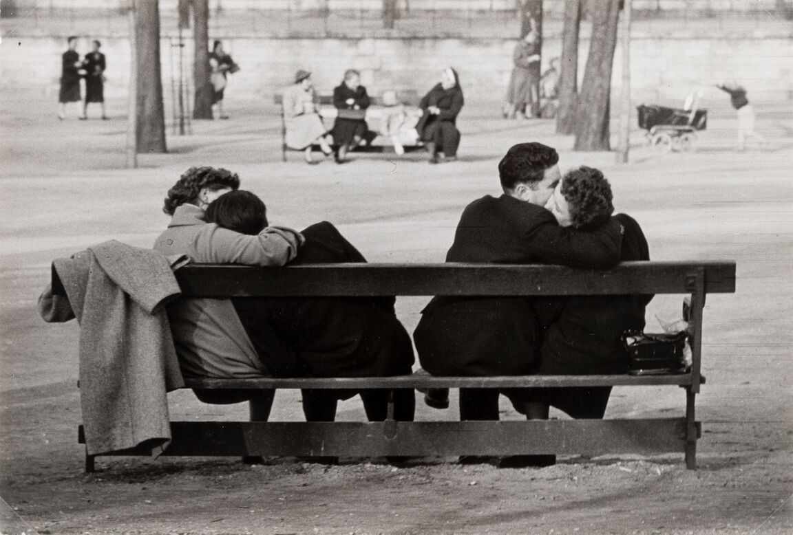 В объективе Анри Картье-Брессона, поцелуй становится не просто жестом, а способом уловить живость момента и игру случайности. Картье-Брессон, стремящийся к «решающему моменту», показывает поцелуй как спонтанное пересечение движений, эмоций и пространства — как на снимке, где девушка просто прислоняется к фонтану, чтобы напиться.