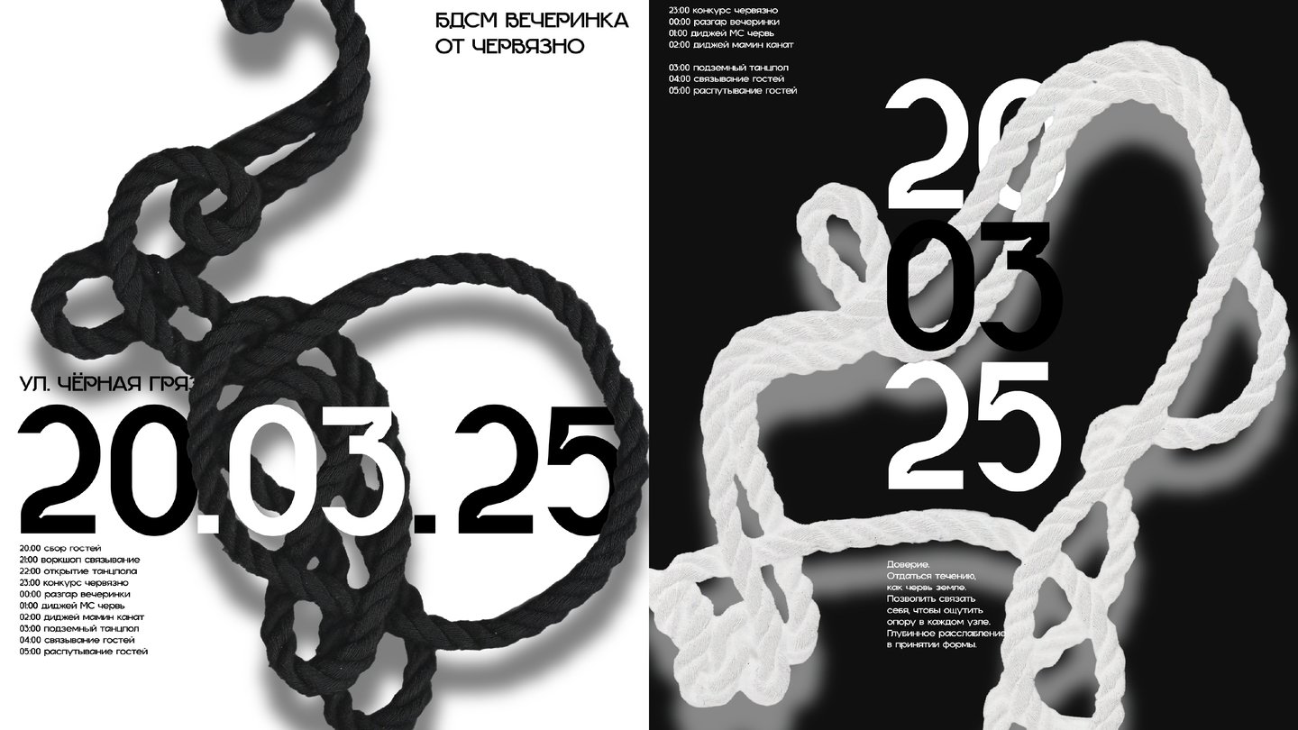 «БДСМ» — материализация аббревиатуры через тактильную метафору. Каждая буква сплетена из канатов. Серия переводит БДСМ из области действий в область чувств: Близость, Доверие, Слияние, Материя.