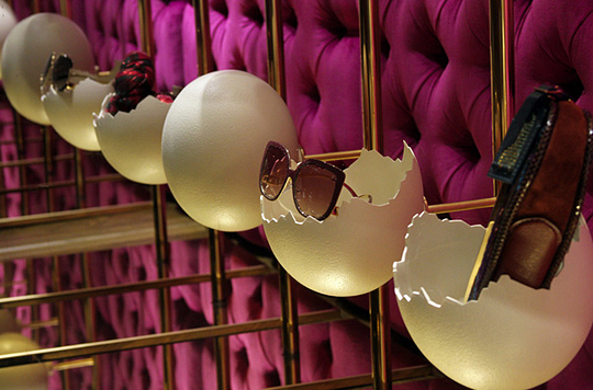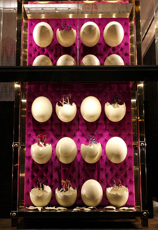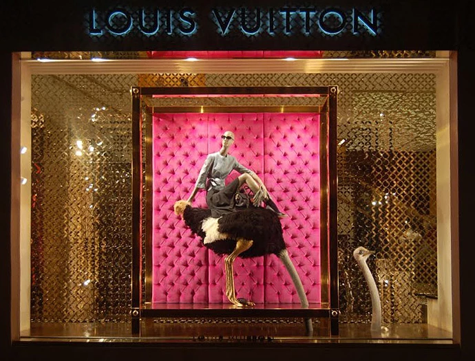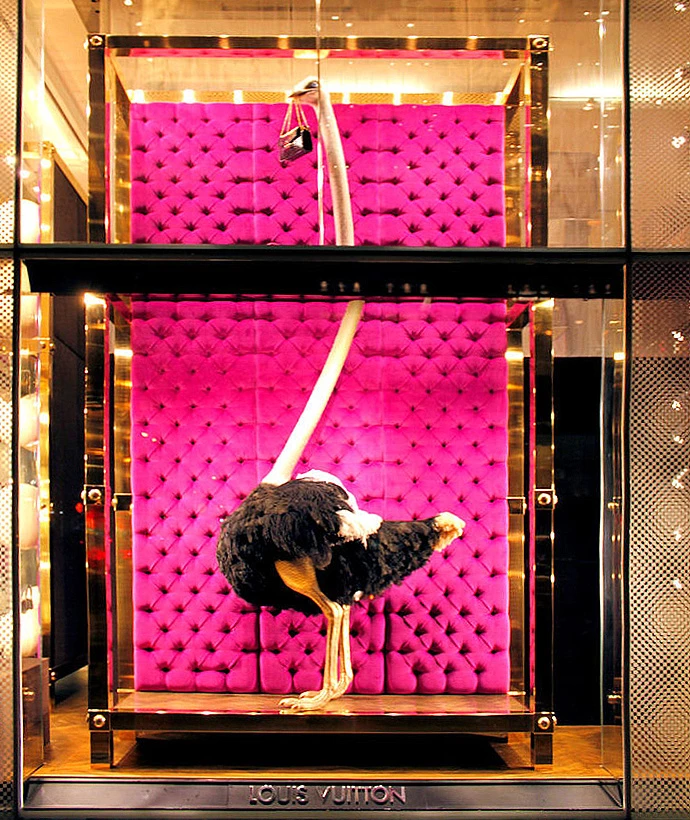 Витрина со страусами в Нью-Йорке и в Лондоне в 2011 году — это одна из самых запоминающихся и креативных инсталляций бренда. Она была частью их рождественского оформления витрин. Основная идея витрины заключалась в сочетании роскоши и сюрреализма. В декорации использовались большие белые страусы с вытянутыми шеями, которые выглядывали из позолоченных рам. Они держали в клювах сумки и аксессуары бренда. Страусы выглядели как своеобразные манекены, но с юмором и лёгкостью, создавая впечатление, что они «презентуют» продукцию