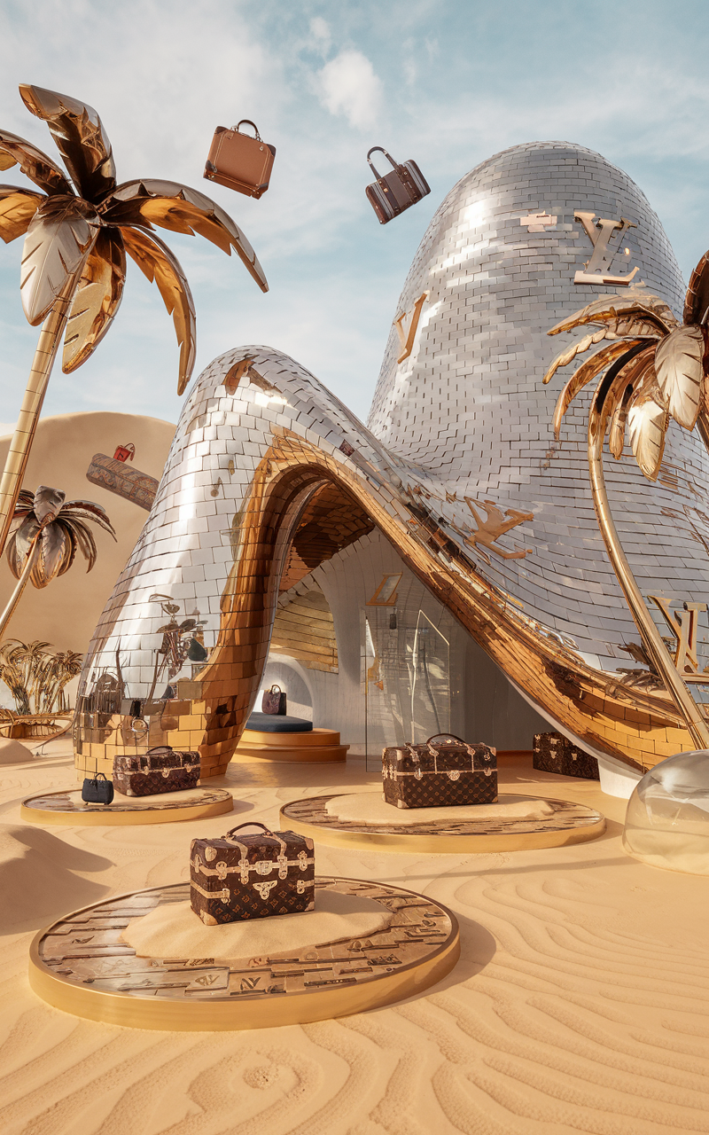 Вдохновением для этого поп-апа становится идея путешествия в край света, где реальность встречается с миражами — современный оазис среди песков. Это не просто бутик, а точка отдыха для путешественников будущего.