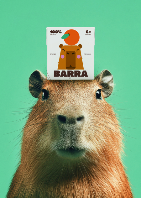 На создание детских соков Barra вдохновила популярная фотография капибары с мандарином на голове. Этот образ идеально передаёт атмосферу бренда: натуральность, заботу о детях и лёгкую игровую подачу.