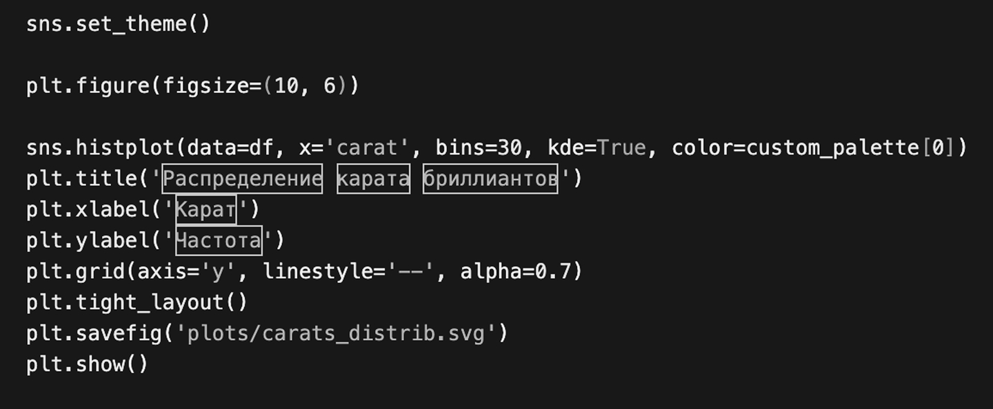 Гистограмма (1)— отображает распределение карата бриллиантов. Такая диаграммы наглядно показывает, как часто встречаются разные значения карата и позволяет легко увидеть общее распределение данных.