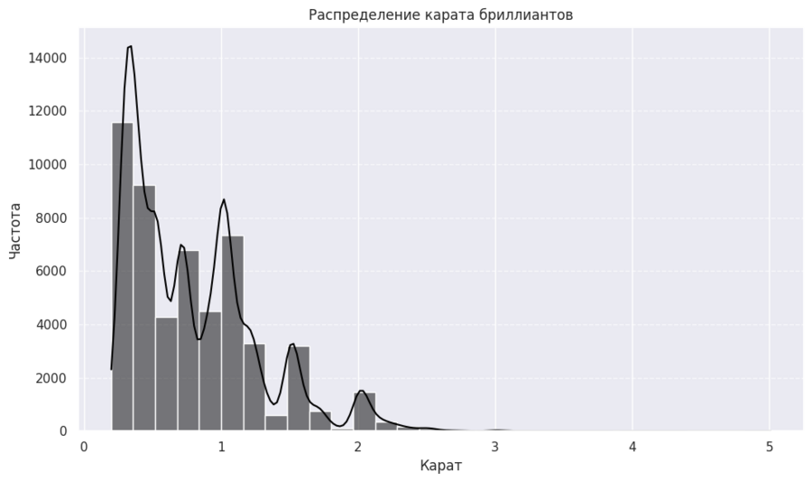 На гистограмме показано распределение карата бриллиантов, где видно, как часто встречаются камни разного веса. Основная масса бриллиантов сосредоточена в диапазоне от 0,2 до 1 карата, что отражается высокими столбцами в левой части графика. По мере увеличения карата частота резко уменьшается, и крупные бриллианты встречаются заметно реже.