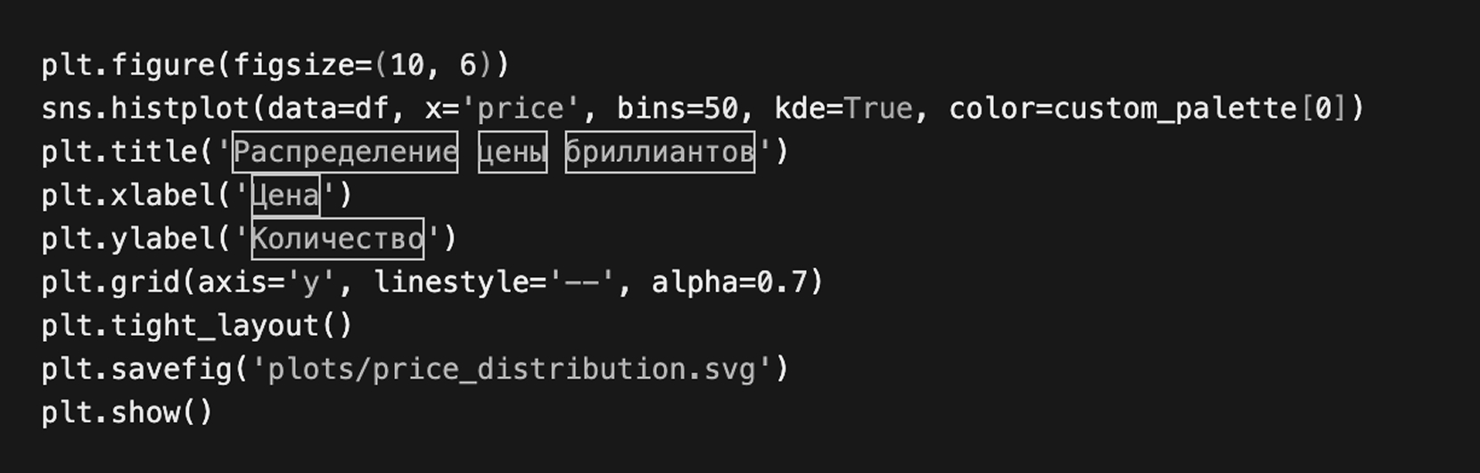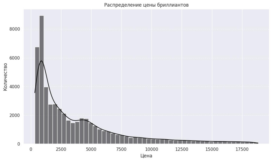 График показывает, что самые распространённые бриллианты имеют относительно невысокую стоимость. Дорогие бриллианты встречаются значительно реже, что подчёркивает их эксклюзивность и ограниченное количество в датасете.