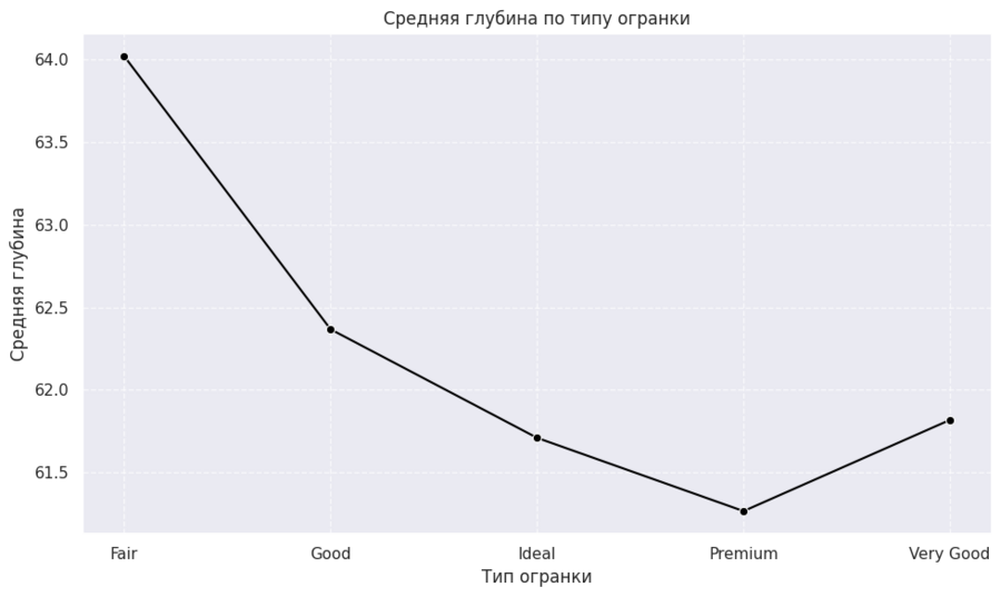 График показывает, что более качественная огранка обычно связана с меньшей средней глубиной бриллианта. Это может означать, что лучшие типы огранки предполагают более точные пропорции, что влияет на внешний вид и качество камня.