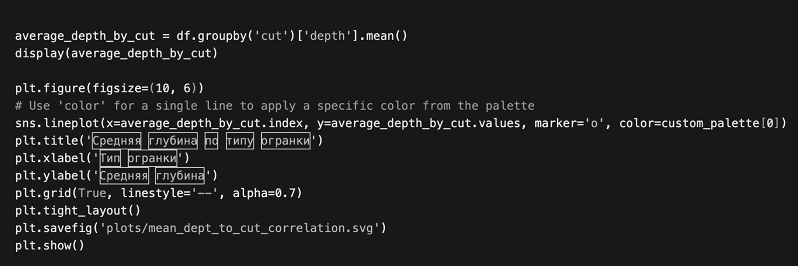 Линейная диаграмма — показывает среднюю глубину по типу огранки, позволяет легко увидеть общую тенденцию и сравнить категории между собой.