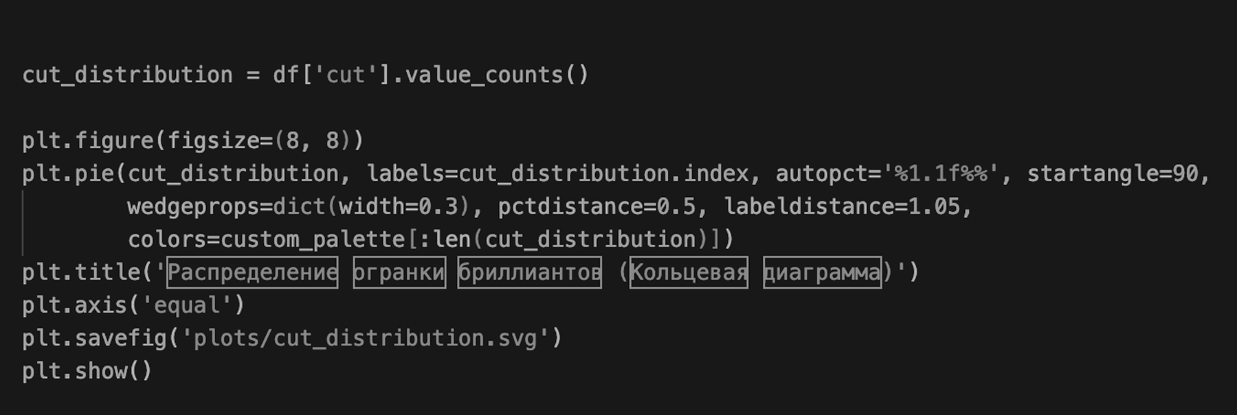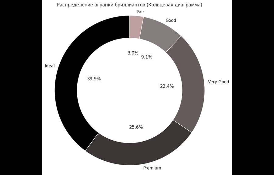 На кольцевой диаграмме показано распределение типов огранки бриллиантов, где каждый сегмент отражает долю определённой категории. Наибольшую часть занимают бриллианты с огранкой Ideal — почти 40%, затем следуют Premium и Very Good. Меньше всего представлены огранки Good и Fair, которые занимают небольшие сегменты.