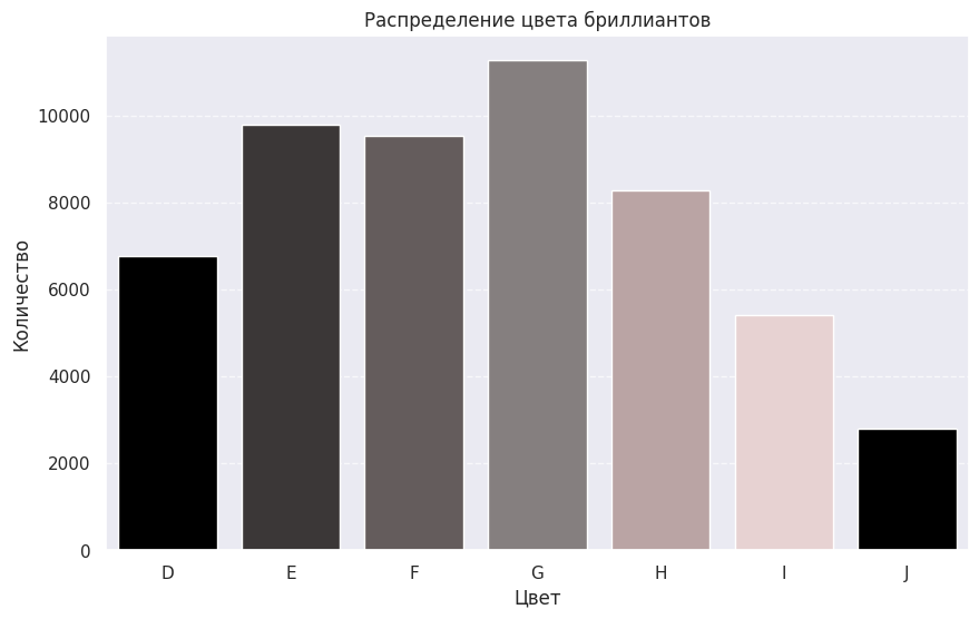 Диаграмма показывает, что наиболее распространёнными цветами в датасете являются G, E и F, что может отражать их популярность или доступность на рынке. Наименее распространёнными оказались бриллианты цветов I и J, что может указывать на меньший спрос или более редкое появление таких экземпляров в выборке.