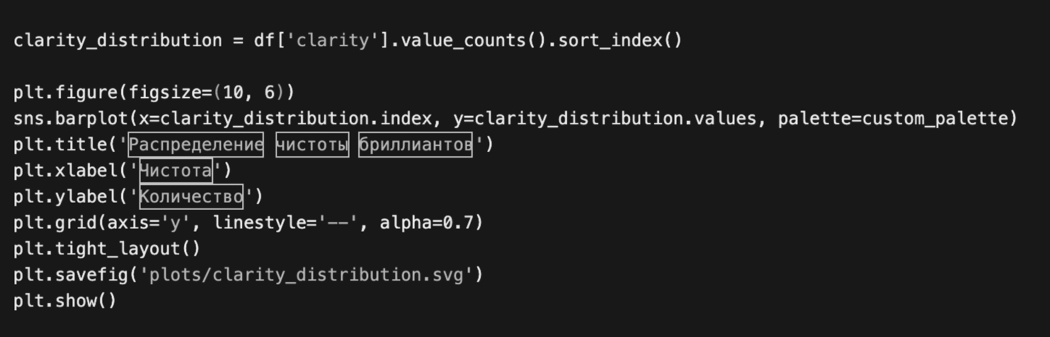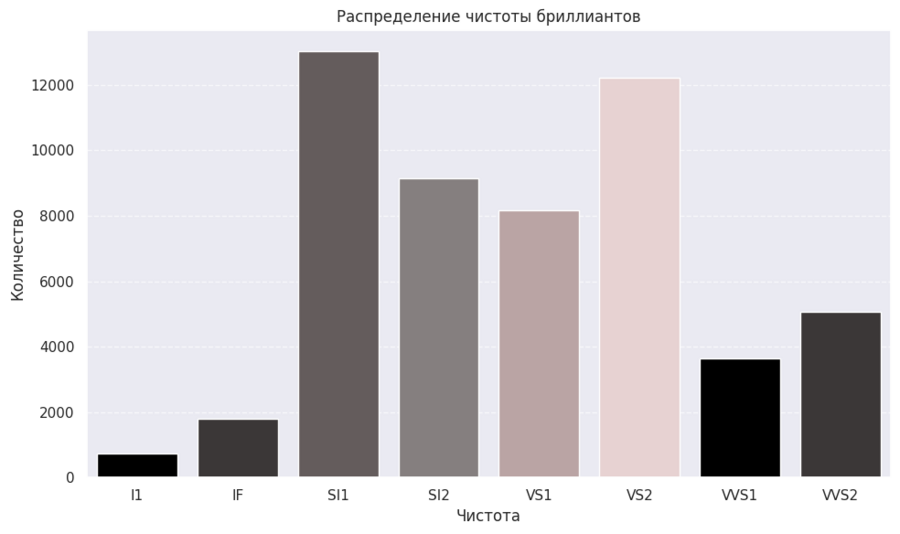 Диаграмма показывает, что наиболее распространёнными являются бриллианты средних уровней чистоты — SI1, SI2 и VS2. Наименее распространённые категории I1 и IF встречаются редко, что подчёркивает их либо низкое качество, либо ограниченное количество таких камней в датасете.
