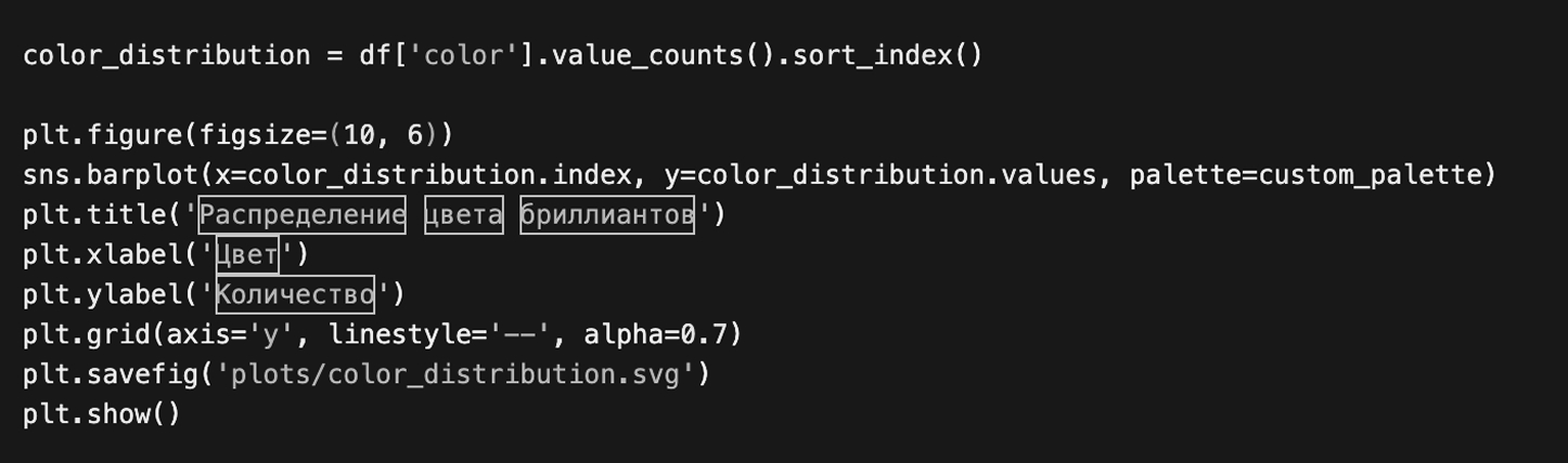 Столбчатая диаграмма (1) — показывает, распределение цвета бриллиантов. Это позволит легко сравнить количество бриллиантов разных цветов и сразу увидеть, какие категории встречаются чаще остальных.