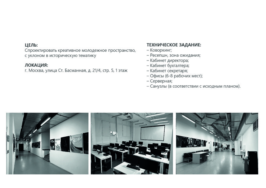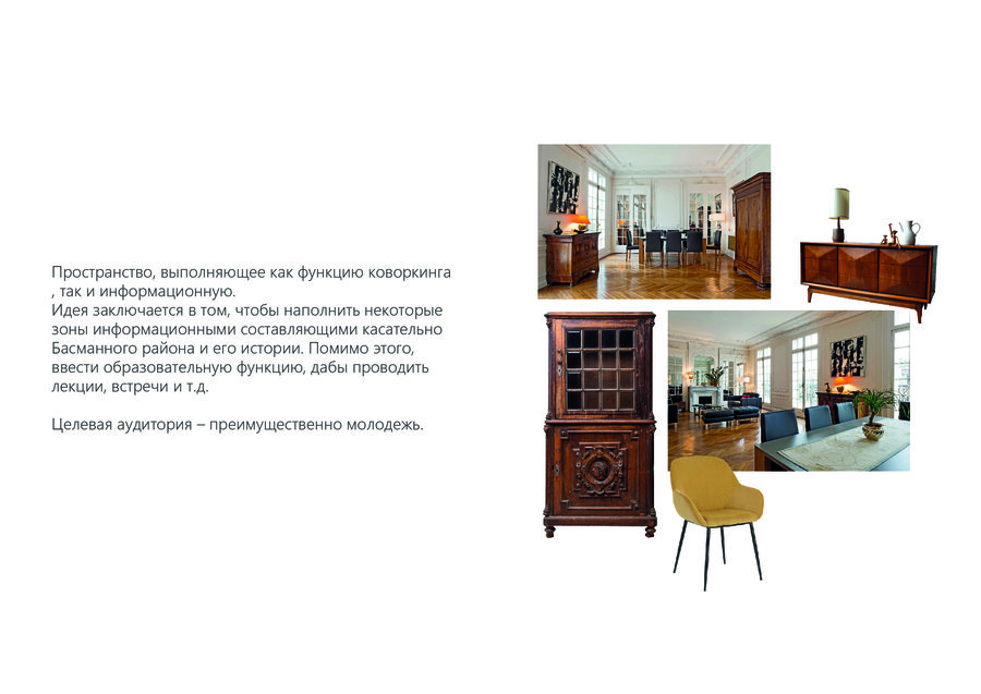Проект представляет собой дизайн-проект креативного молодежного пространства, которая находится по адресу Старая Басманная, 21, корпус 5. Основная задумка — использование антикварной мебели в пространстве.