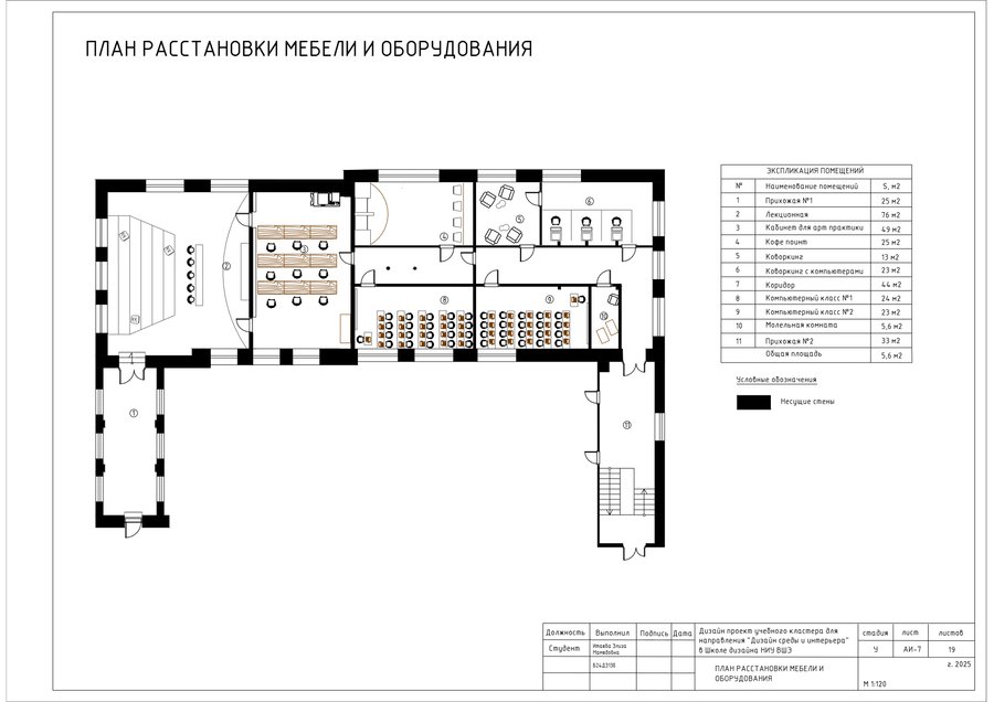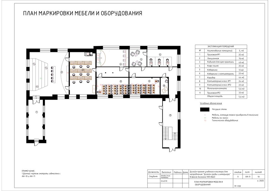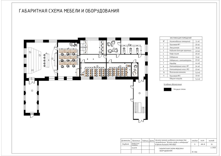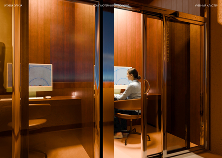 Дизайн учебного кластера перекликается с прошлым здания Школы Дизайна и культурным кодом советской эстетики, близкой к сердцу любого россиянина. В этом интерьере встречаются различные материалы и детали, напоминающие советскую эпоху и отечественный культурный код — от кружева на столе, до стеклянных блоков на кухне кофе поинта.