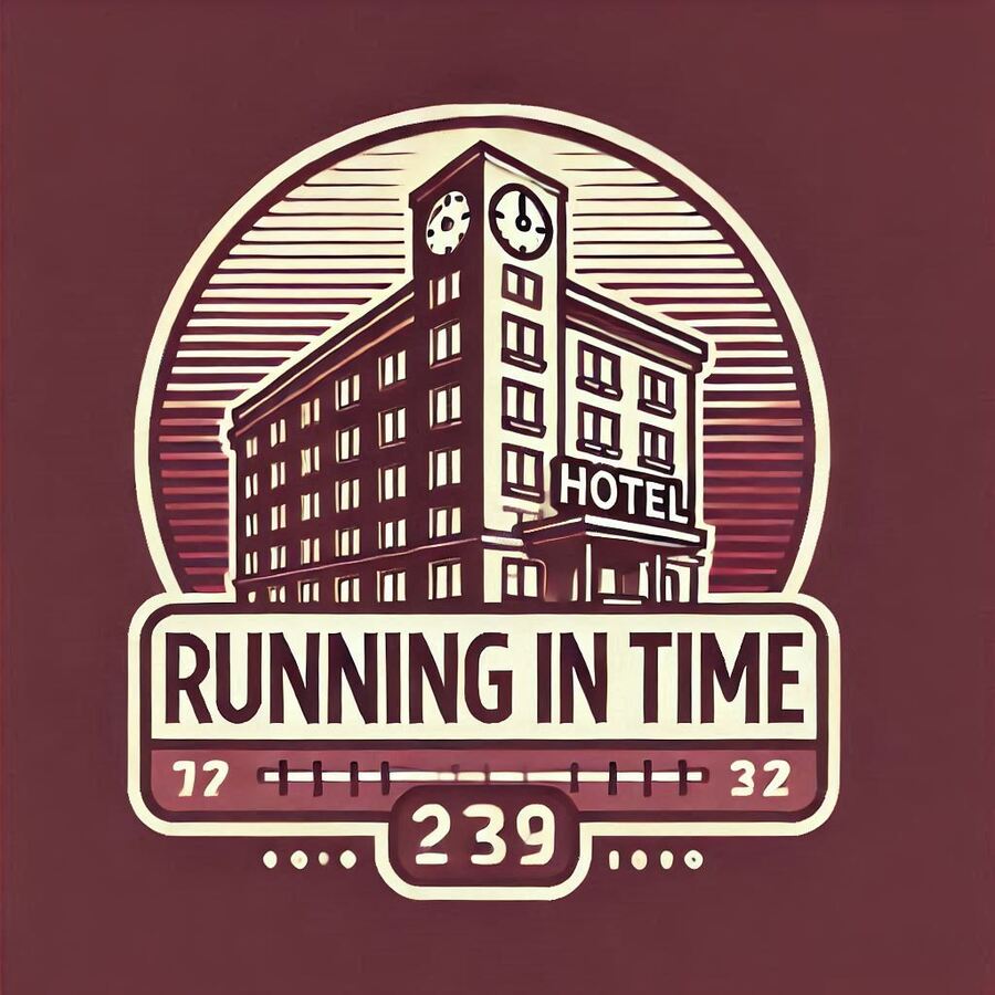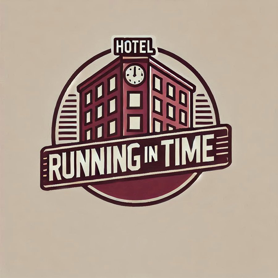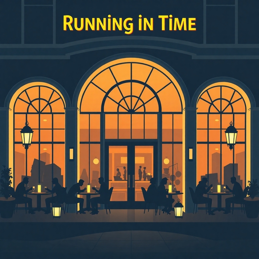 Prompt: «Running in Time», vintage poster, «Hotel in art deco style» poster. The text is written in gold and blue tones. The entrance to the retro hotel with arches and large windows, glass, through which a warm yellow light is visible. Inside, people are sitting at tables, illuminated by lanterns. The atmosphere conveys elegance and retro style, with soft pastel colors, in a vintage print.