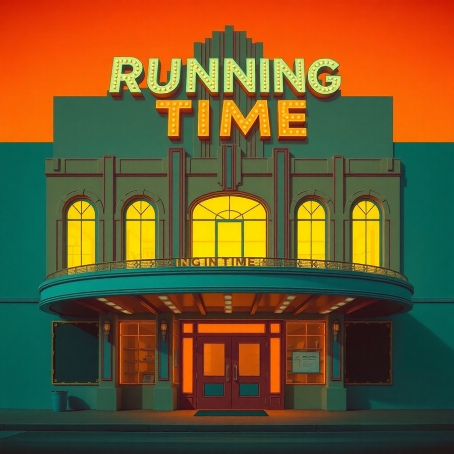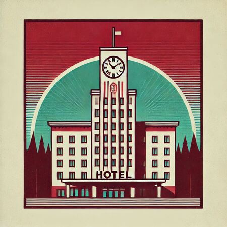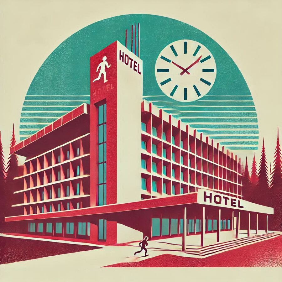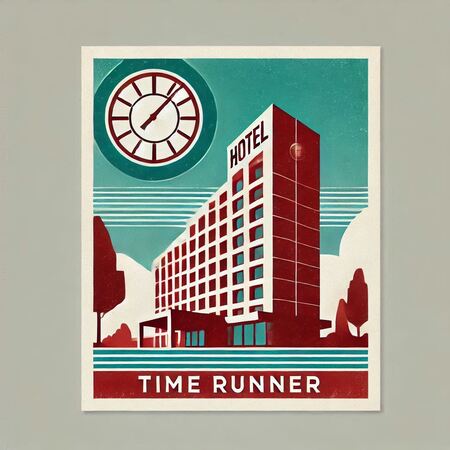 Prompt: A large empty billboard along a road surrounded by nature, evening, The billboard advertises the hotel «Running in Time». The billboard is made in burgundy tones with the addition of blue. The word «Running in Time» on the billboard is easy to read and glows. The billboard is a minimalist hotel. The billboard contains the hotel address and other necessary information in small print. Shot on a point-and-shoot camera with soft shadows, low contrast and clean, sharp focus. Vintage banner of the hotel «Time Runner» rectangular format, with a white background and a color palette of turquoise and red. The design is made in a modernist architectural style, minimalism in the form of a drawing of heads from the 60s
