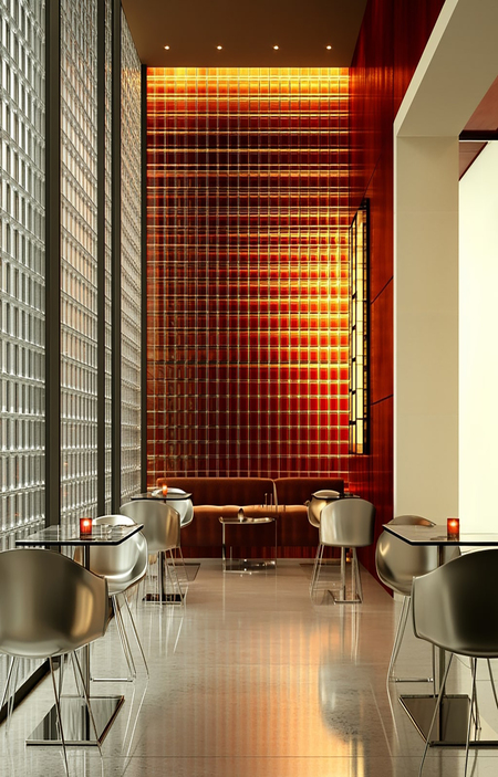 Prompt: A small hotel bar in the style of Tadao Ando. Large windows with silver chairs around them. The interior design is dominated by burgundy walls. Interior visualization of modern architecture. Glass front wall and windows. The wall is covered with square tiles with red patterns. There is an empty table for four. The wine rack is located behind the glass table. The shot is directed straight ahead. Along the yellow wall of square glass blocks there is a swamp-colored sofa, opposite it there are 4 small silver tables and chairs at each table 2 silver mirimalistic chairs, on the right you can see a little staircase with lighting
