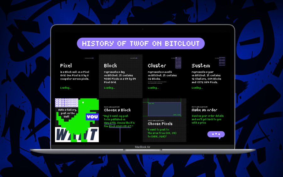 Модульный шрифт TWOF разработан в рамках проекта «The Wall Of Fame» на BitClout — новой социальной сети на блокчейне, в которой вы можете инвестировать криптомонеты в любых пользователей, а ещё создавать и приобретать NFT