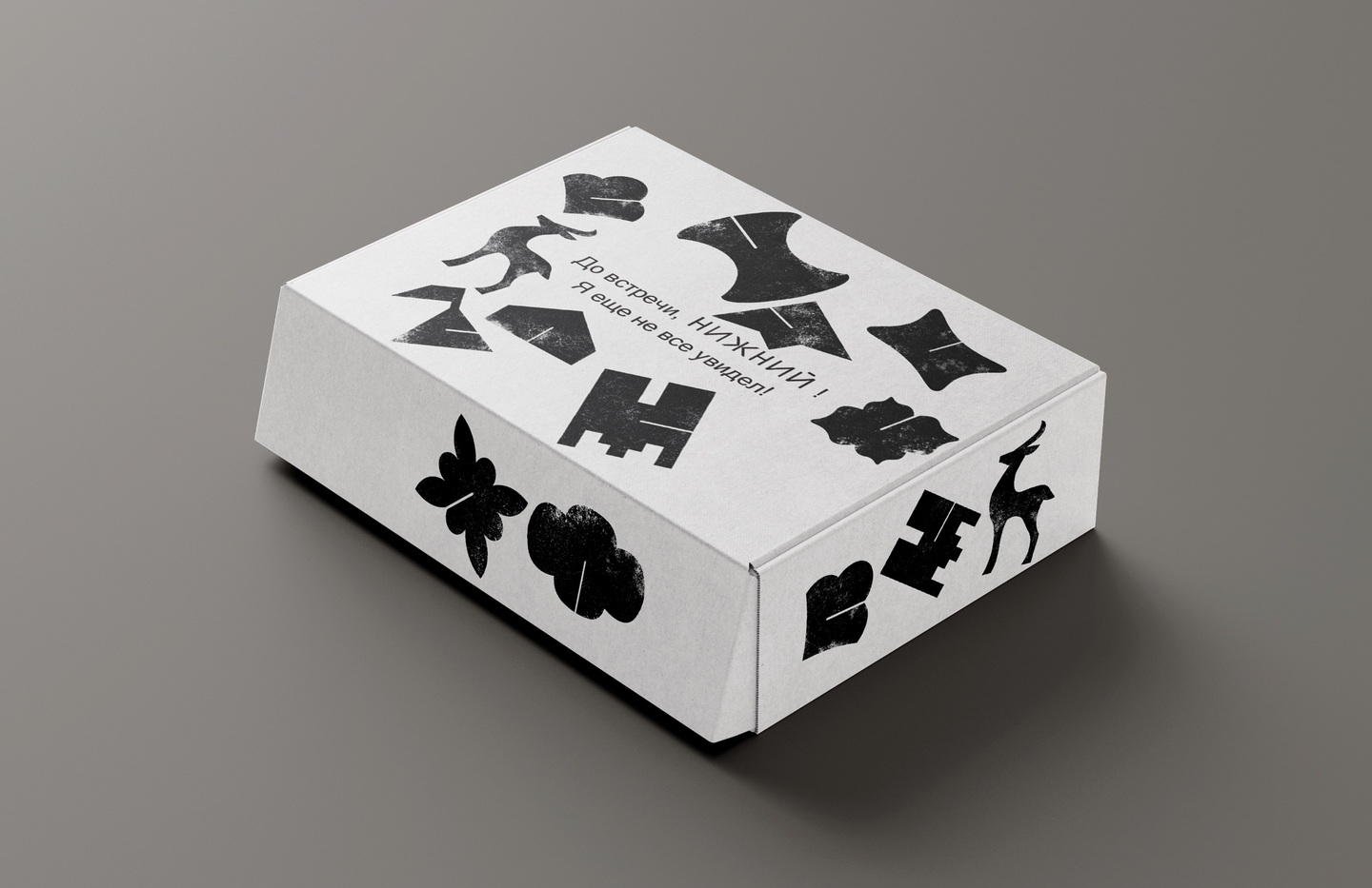 Магазин «Нижний 800» производит и продает сувениры, связанные с Нижним Новгородом. За основу стиля взяты элементы символов города. Они изображены с текстурами, чтобы передать вылепленность, живость архитектуры.
