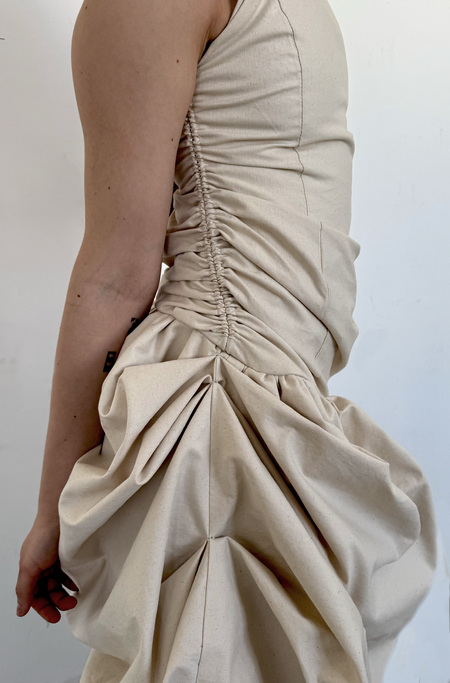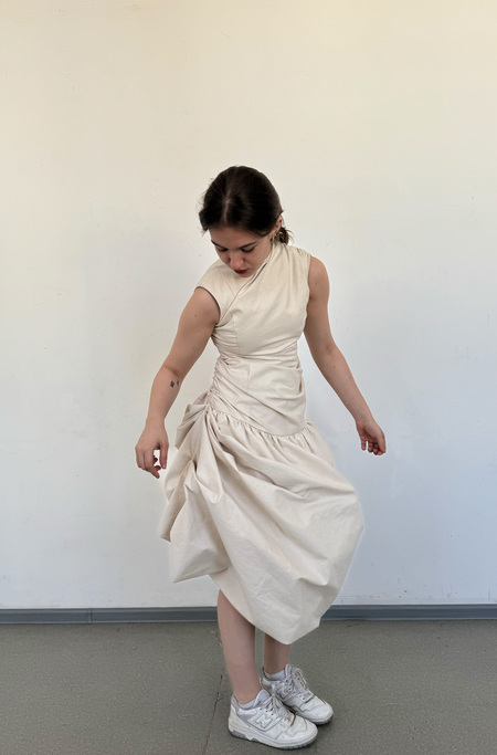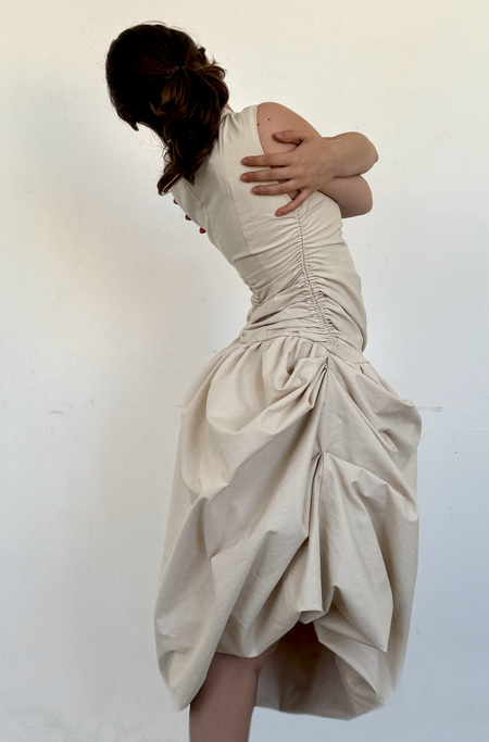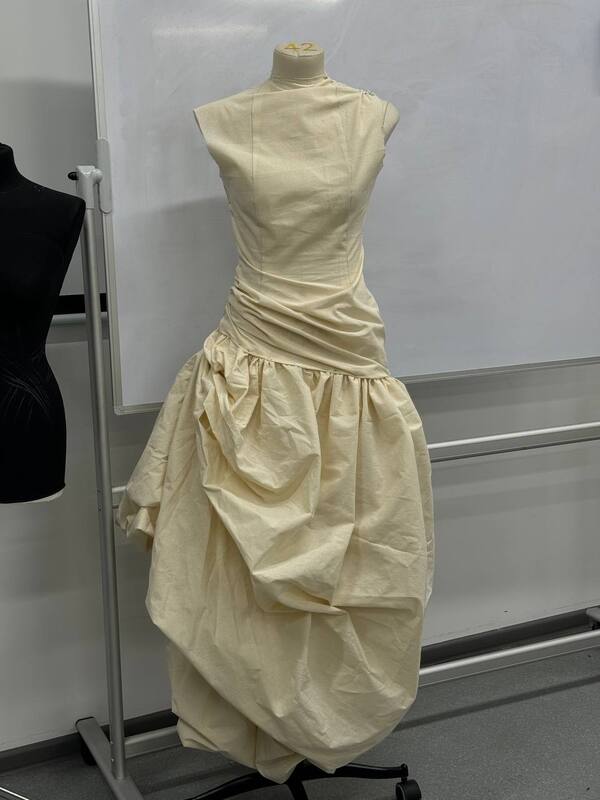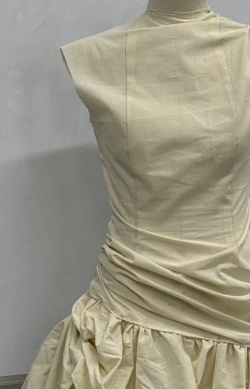 За референс для лифа был взят топ со складками в плечевом и боковом швах. Складки в плечевом шве сформированы за счет сборки строчкой. Сброка в боковом шве сформирована с помощью резинки. В обработке горловины и пройм использован подклад, он используетсч в том числе для более стабильной фиксации юбки-баллона. Лиф построен путем конструирования.