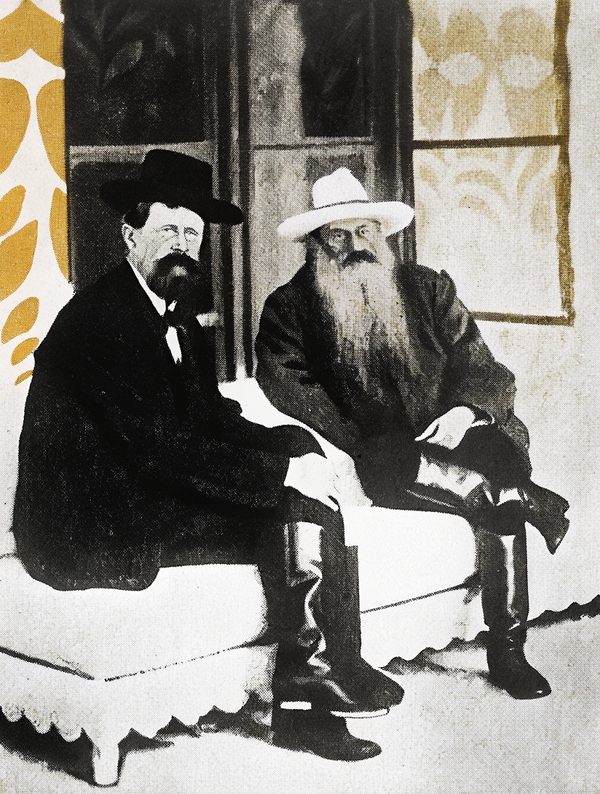 Сгенерировано при помощи recraft.ai. промпт: create Tolstoy with a big and long beard and Chekhov with a short and black beard and pince-nez are sitting at a table drinking tea