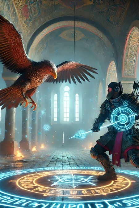 Нейросеть: https://t.me/yes_ai_bot Prompt № 2 In an abandoned Orthodox church, there is a battle between a Slavic warrior and a sirin bird. An armored warrior with built-in technological gadgets uses energy arrows, and sirin is protected by magical barriers. Glowing runes dance around them.