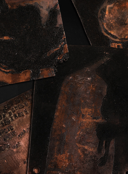 Техника — сухая игла. Отрывки текста выбиваются вручную ударными клеймами, что отсылает к положению выживших внутри компьютера. После нанесения букв и иллюстраций на медь, пластины травятся в кислоте.