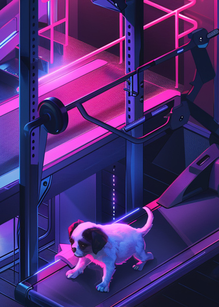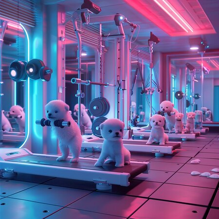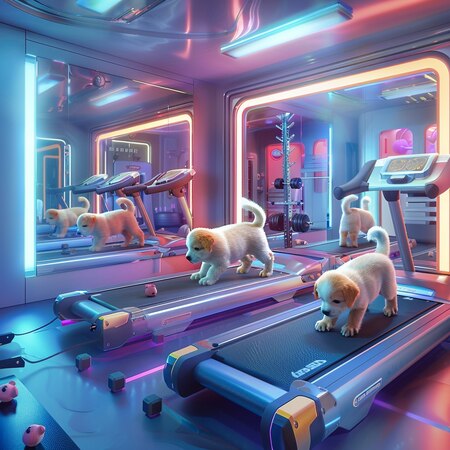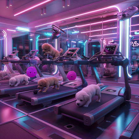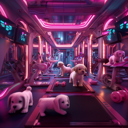 Prompt: A futuristic gym filled with puppies of different breeds training on professional machines. One puppy lifts dumbbells, another runs on a treadmill, a third does stretches on a mat. The atmosphere is energetic and fun, the lighting is soft, with neon accents. The gym’s design is modern with mirrors, fitness equipment and stylish details.