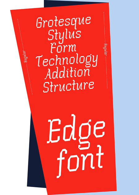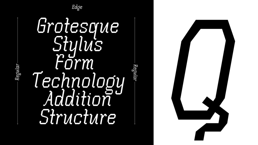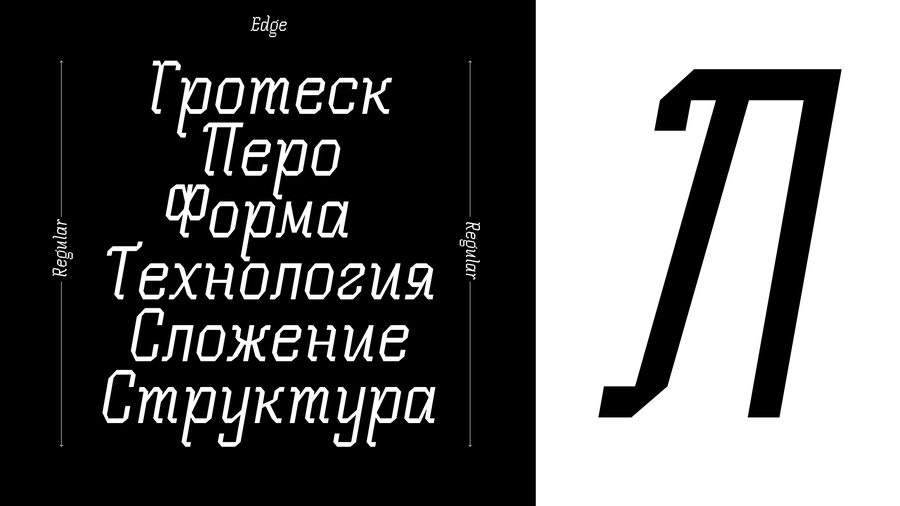Шрифт переосмысляет рукописную готику от пера. В его основе — характерные угловатые засечки и ломаная пластика готического письма. В результате возникает гибрид рукописной готики и гротеска — сочетание угловатости, ритма письма и технологичности формы.