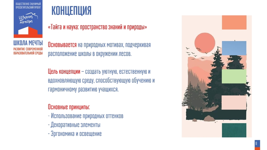 Основная концепция проекта связана с тайгой: дизайн вдохновлен природным ландшафтом сибирского леса. Это отражается в выборе материалов, цветовой палитре и организации пространства, создающих атмосферу уюта, свободы и единения с природой.