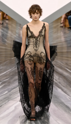 Гальяно черпал вдохновение повсюду: в восточных культурах, парижской уличной моде, мифах и литературе. Одним из самых ярких образов коллекции стал корсет, инкрустированный жемчугом и украшенный сложной вышивкой, который сочетал чувственную элегантность с королевским шиком.
