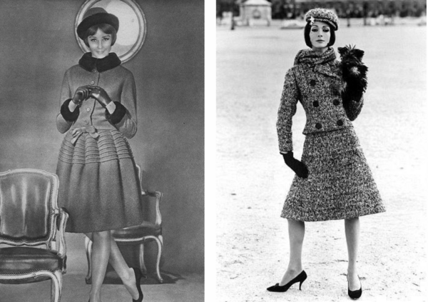 - Slim Look (1961): — Более узкие жакеты и прямые юбки, сохраняющие тонкую талию, но без излишней пышности. — Силуэт стал более гибким и мягким, адаптированным под повседневную жизнь. — Уменьшена объемность юбок, акцент сместился на элегантность и практичность. — Общий образ стал менее формальным, более удобным для современной женщины.