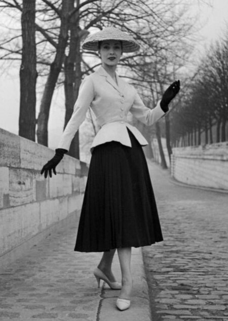 В 1947 году Кристиан Диор представил свою первую коллекцию, которая стала настоящим прорывом в мире моды. В послевоенной Франции, после лет лишений и строгих военных норм, он предложил женщинам новую эстетику — подчеркнутую талию, пышные юбки, мягкие плечи, корсеты и роскошные ткани. Главной деталью стал знаменитый жакет Bar — приталенный жакет с баской, визуально сужающий талию и расширяющий бедра, что создаёт силуэт «песочных часов». Этот силуэт быстро стал культовым и стал визитной карточкой длительного наследия бренда.