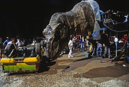 Практические динозавры эксплуатировались совместно с компьютерными кадрами — практическая аниматроника давала ощущение веса и осязаемости в кадре.