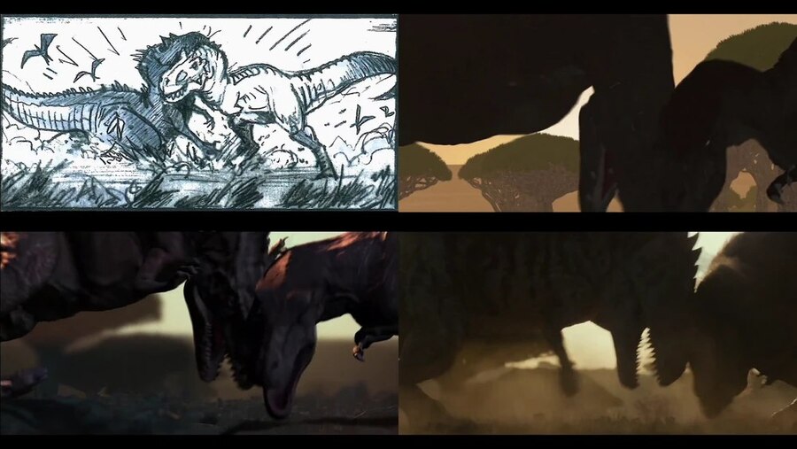 Слева — CGI — атака велоцирапторов. VFX-супервайзер: Тим Александер (ILM) Справа — CGI — бой динозавров в тёмной сцене / Jurassic World (2015). VFX-супервайзер: Тим Александер (ILM)