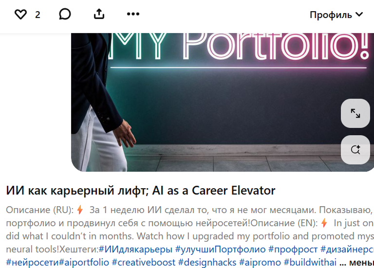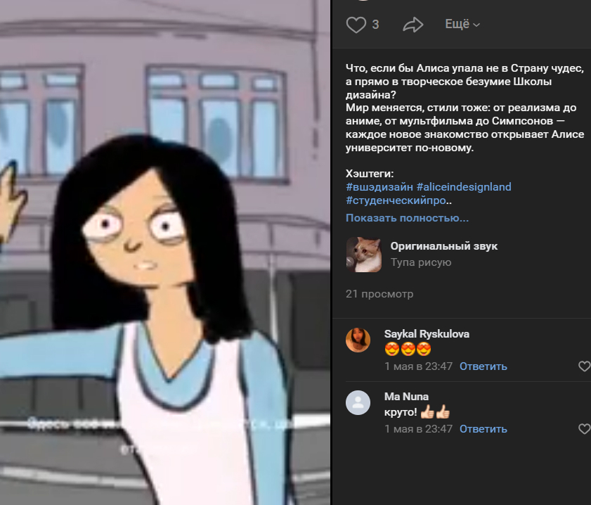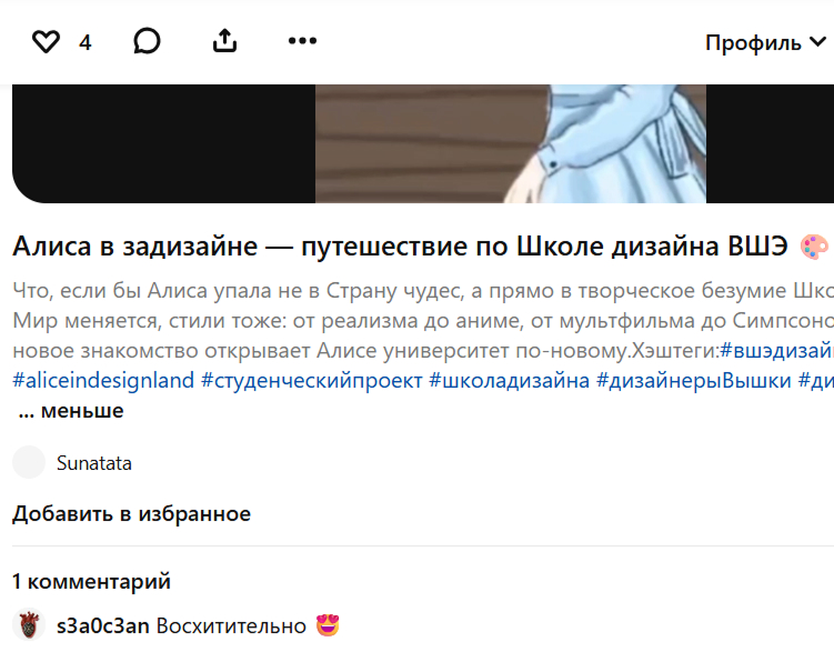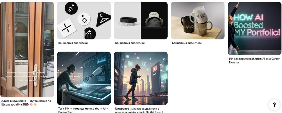 Это было также замечено на платформе Pinterest, где было выложено то же самое видео группового проекта из 1 курса «Алиса в задизанье». Вместе с видео в Pinterest были опубликованы дизайн работы, а также картинки, сгенерированные при помощи нейросети Recraft. Во всех постах использовались хештеги, сделанные в Chat GPT. Тем не менее видеоролик опередил их по вовлеченности.