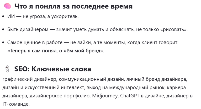 Хочется приметить, что хештеги созданные при помощи нейросети отлично справляются со своей задачей в рекламе постов и эффективны в продолжительной перспективе. При работе с ИИ были развиты навыки визуального сторителлинга, адаптация контента на разных платформах и повышение качества промптов. Нейросеть это отличный инструмент для поисков возможностей и способов в продвижении личного бренда. ИИ может давать полезные советы и корректировать слабые места.
