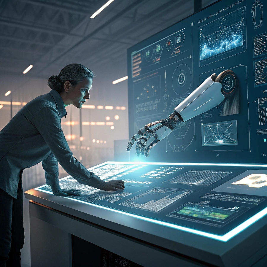 Пример промпта для Chat GPT на создание изображения в Pinterest. «Human and AI working together at a giant glowing desk, one side human hand, the other robotic hand, data and images floating above, collaboration atmosphere, high-tech background — concept art»
