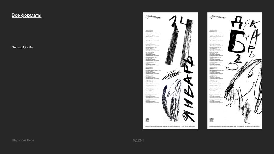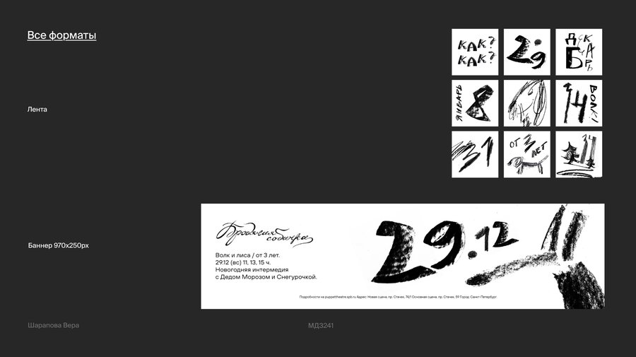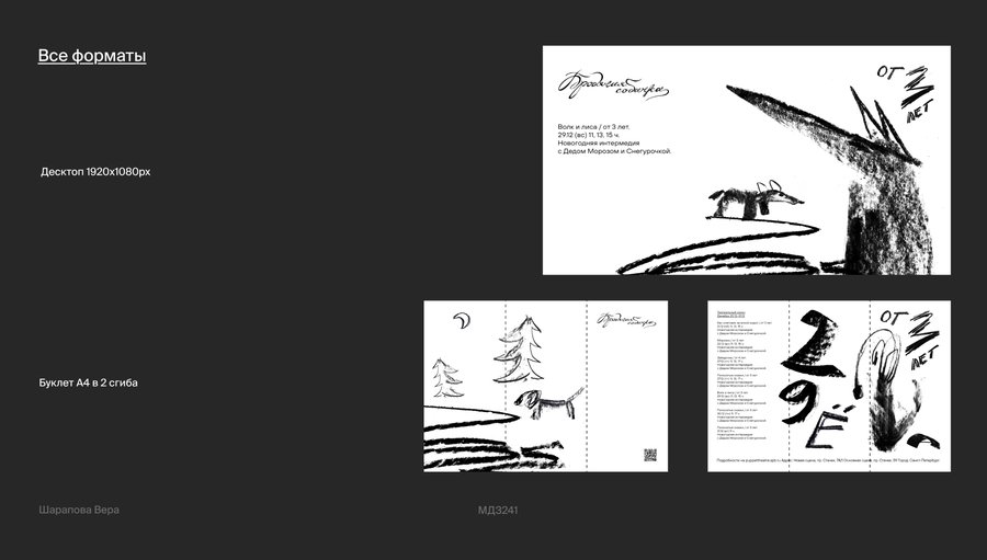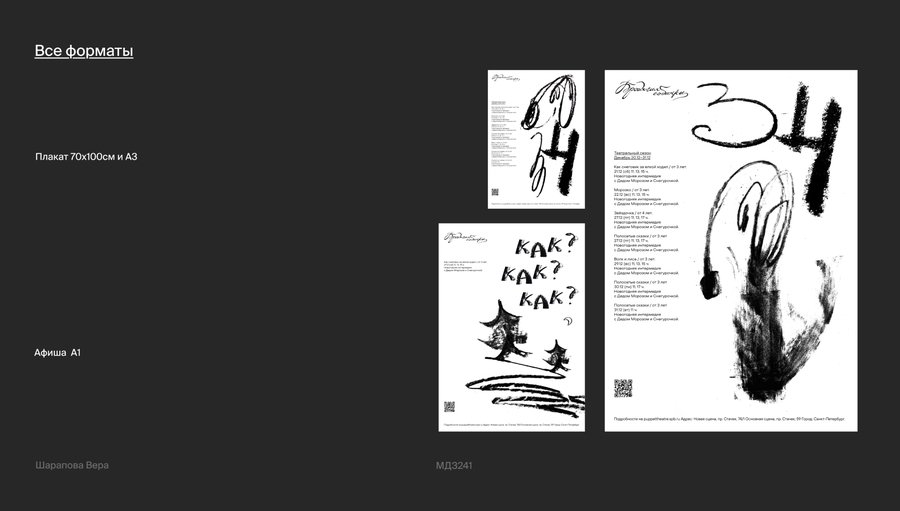 Проект представляет собой разработку афиши-репертуара и ресайз макетов для кукольного театра «Бродячая собачка». Все иллюстрации выполнены вручную угольным мелком и оцифрованы для работы над идеей.