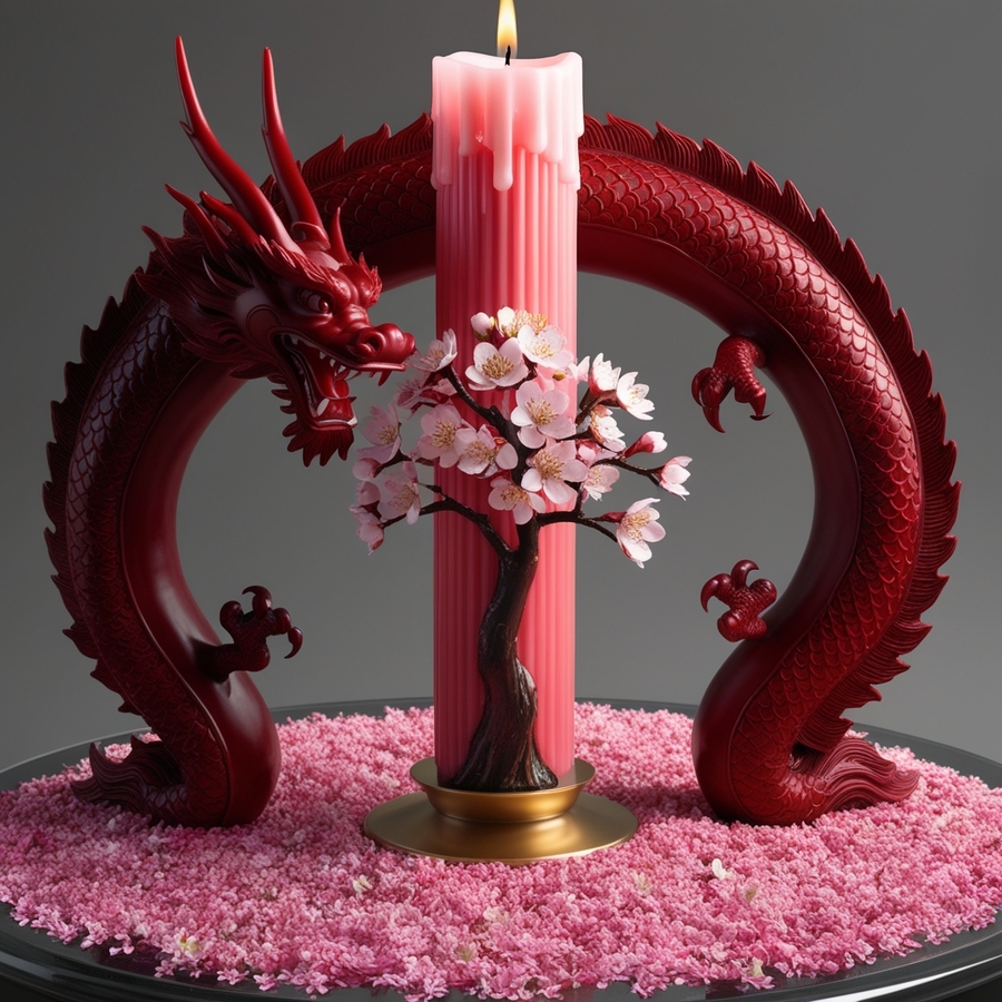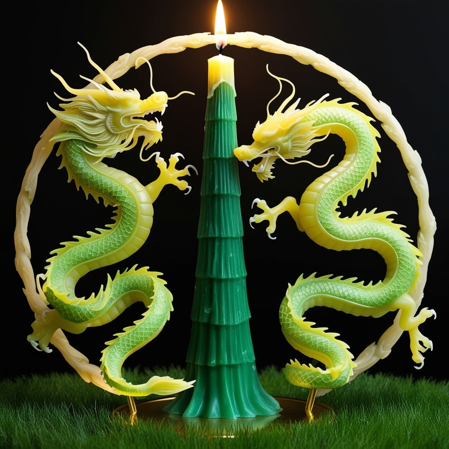 Промпт 1 — create a realistic candlestick in the form of a two vibrant light yellow-ish green detailed Chinese dragons that dynamicly encircle the length of their entire body in a circle around a tall bamboo tree that is a candle with a stand that looks like a grass field add some beautiful realistic light and bloom and there should be a lit wick on the top of a candle in the form of a tall bamboo tree shaped candle black background rich and wealthy style Промпт 2 — create a realistic candlestick in the form of a vibrant dark red detailed Chinese dragon that dynamicly encircles the length of its entire body in a circle around a tall sakura tree that is a candle with a stand that looks like a pink petals field add some beautiful realistic light and bloom and there should be a lit wick on the top of a candle in the form of a sakura tree shaped candle black background rich and wealthy style