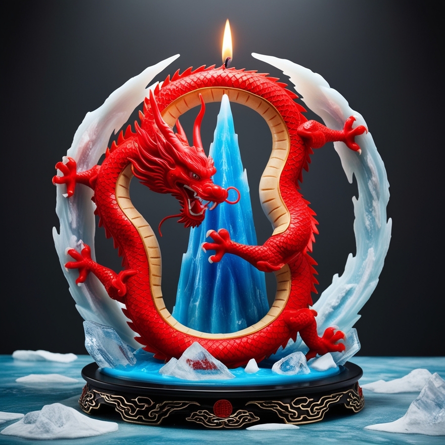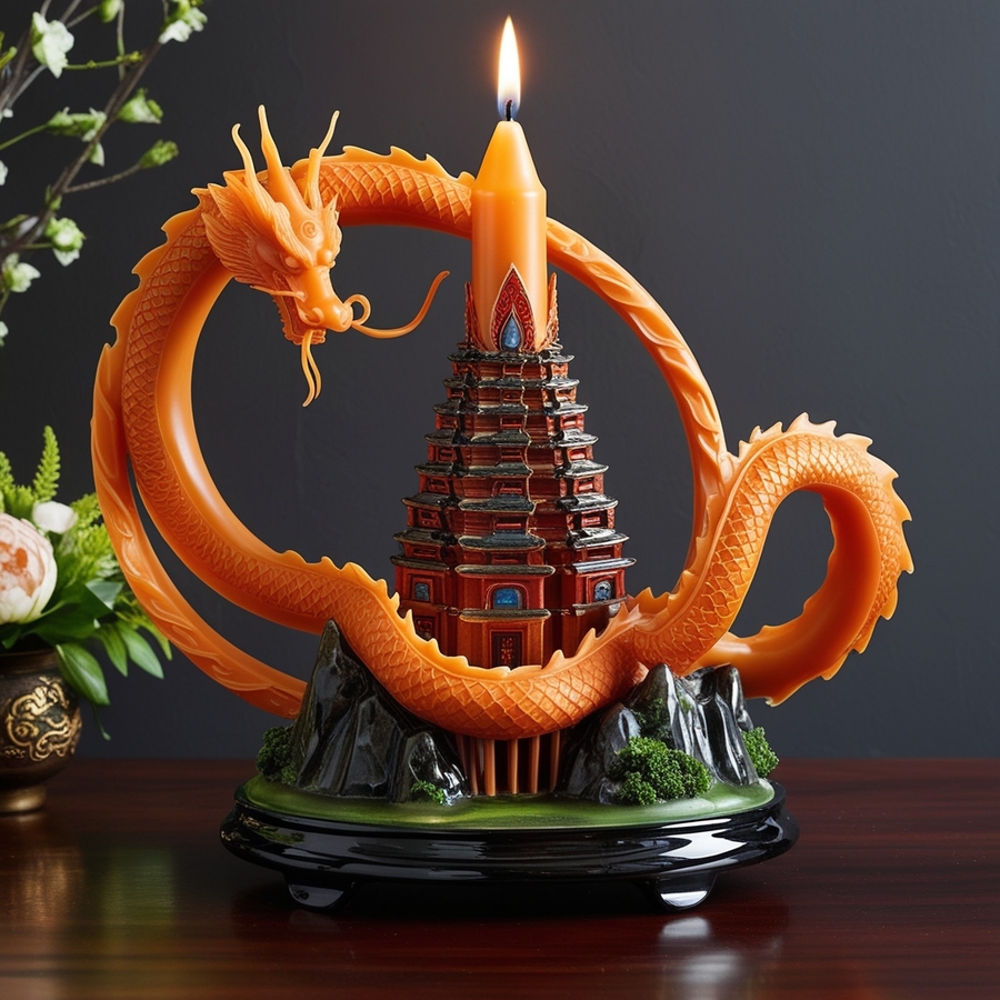 Промпт 1 — create a realistic candlestick in the form of a orange Chinese dragon that encircles the length of its entire body in a circle around a tall Tibetan cone-shaped temple with a stand that looks like a mountain full of greenery add some beautiful realistic light and bloom and there should be a lit wick on the top of a candle in the form of a tall cone-shaped temple black background rich and wealthy style Промпт 2 — create a realistic candlestick in the form of a vibrant red detailed Chinese dragon that encircles the length of its entire body in a circle around a tall blue icy mountain sharp ice with a stand that looks like an arctic ocean add some beautiful realistic light and bloom and there should be a lit wick on the top of a candle in the form of a tall cone shaped icy mountain black background rich and wealthy style Промпт 3 — create a realistic candlestick in the form of a vibrant light yellow detailed Chinese dragon that dynamicly encircles the length of its entire body in a circle around a blue and light purple stylized cloud with a pastel stand add some beautiful realistic light and bloom and there should be a lit wick on the top of a candle